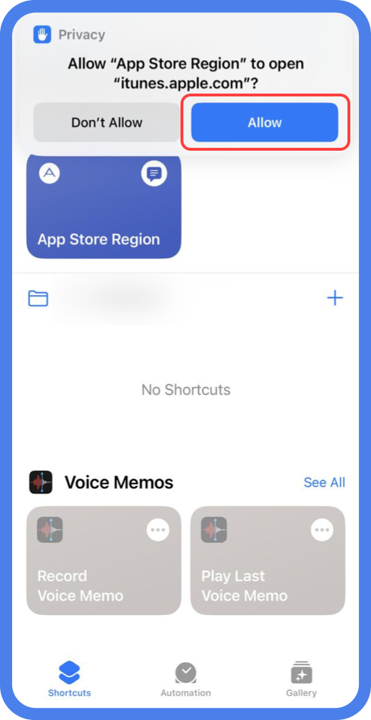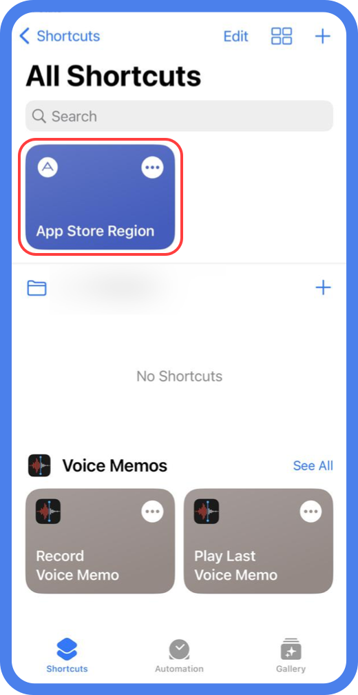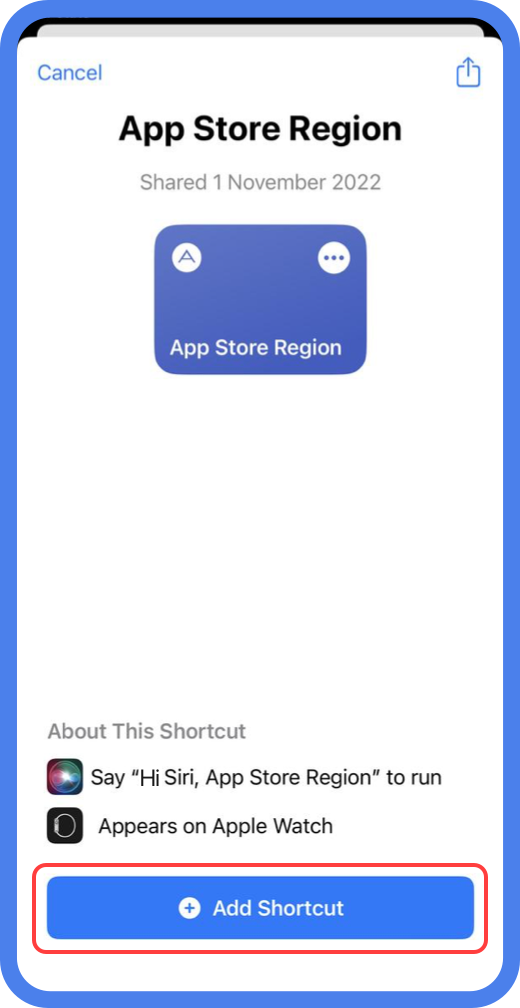 打开快捷指令应用,添加的更改地区指令已经添加好了
