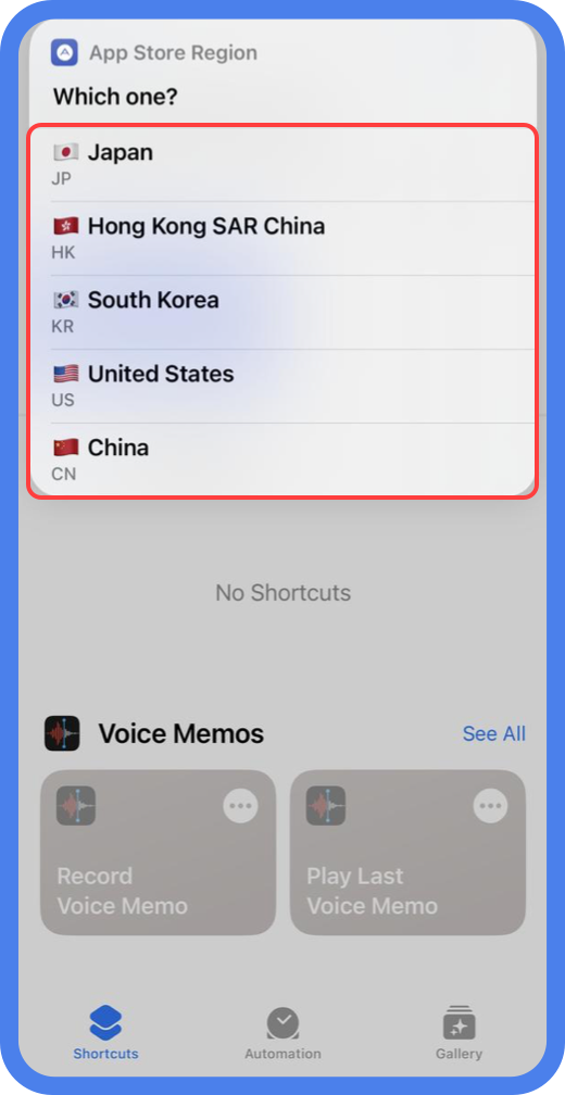 点击更改地区快捷指令,会出现日本、中国香港、韩国、美国、中国